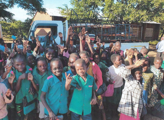 Top photo of 30 desks arriving at Nankuyu Primary School greeted by the happy schoolchildren.